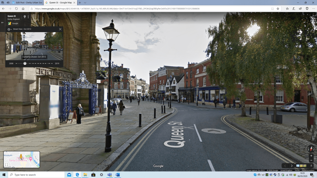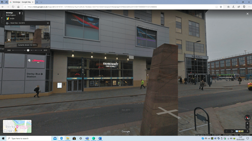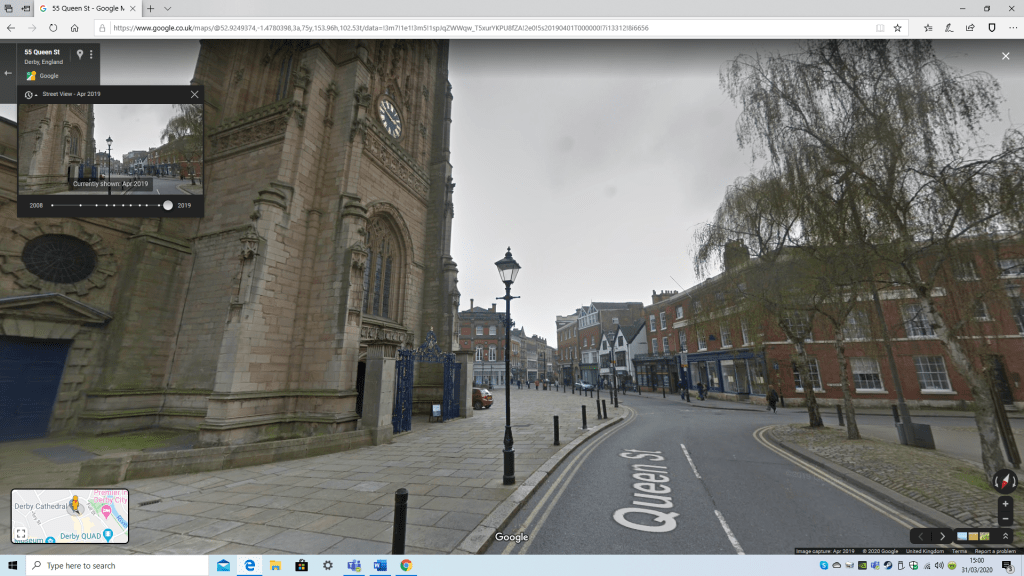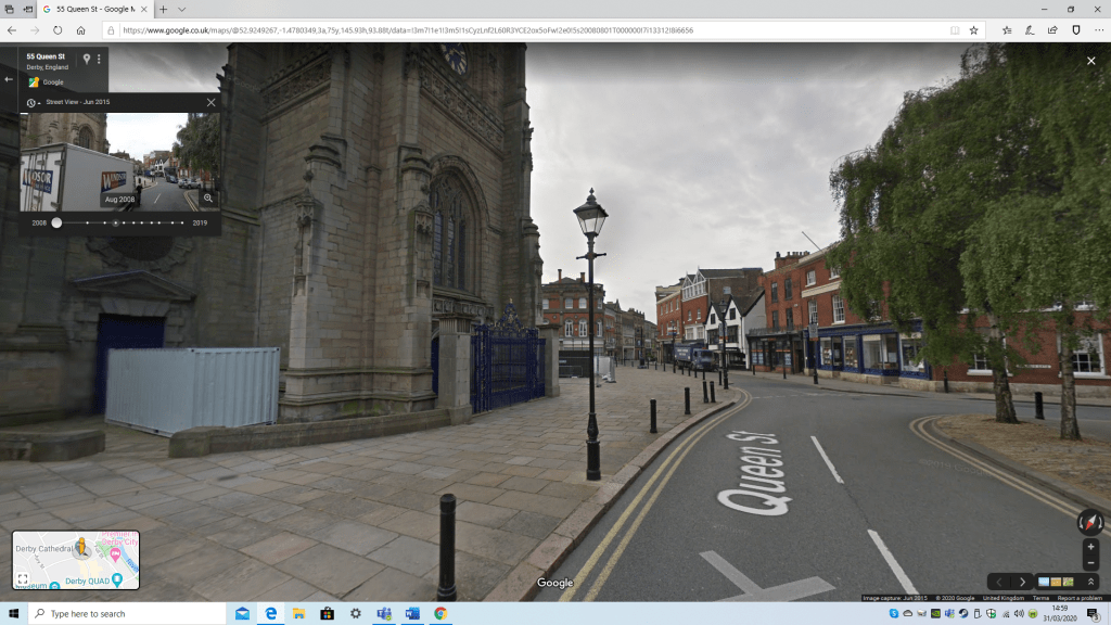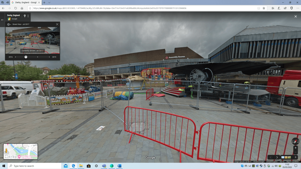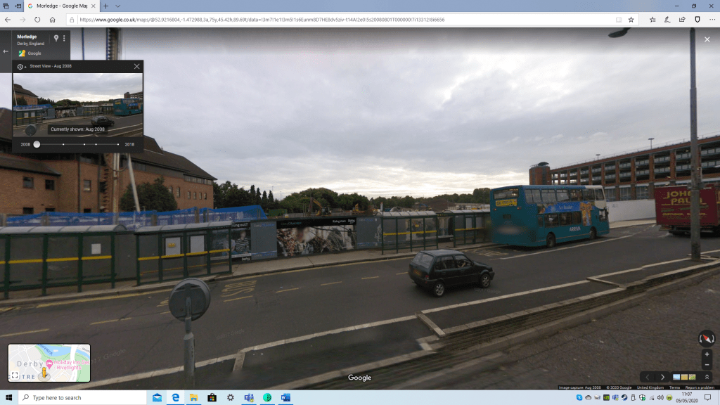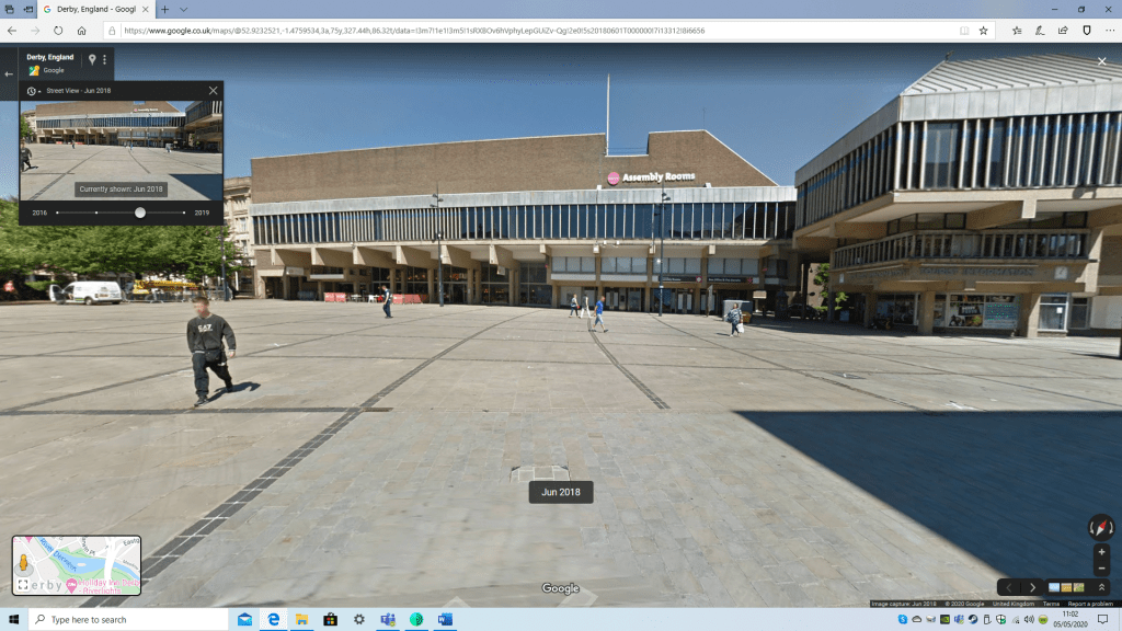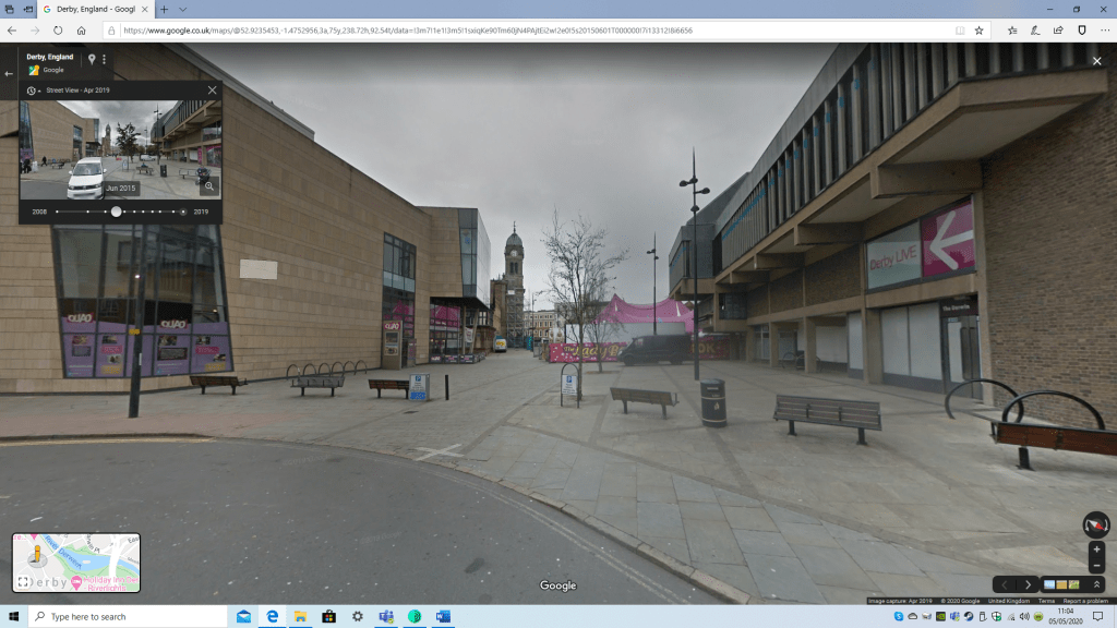 I Went on Google maps and went around several areas in Derby that were of personal interest and used the feature where in some areas of the world, you can change the year so you get a completely different perspective of the world. Because of the nature of my virtual walk, I looked through this from a visual perspective. Much of the Environments I explored has a great deal of familiarity since I visualised these spaces from my commutes from Joseph Wright Centre to Derby Bus Station and the other way around when I was in College. I picked Derby for my virtual walk because it is one of the places I am most familiar with despite my rural residence elsewhere.