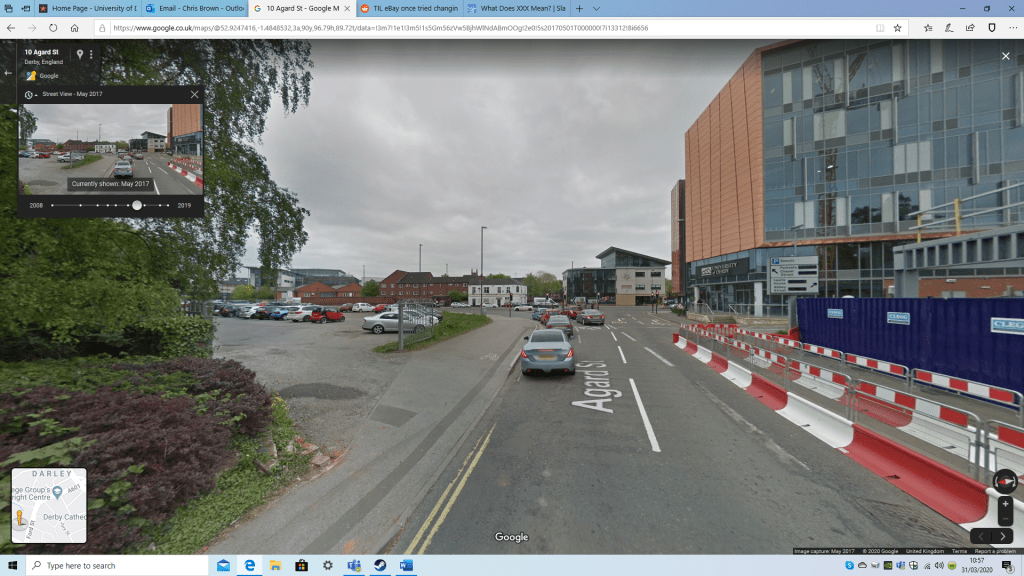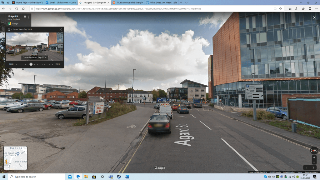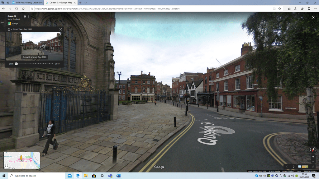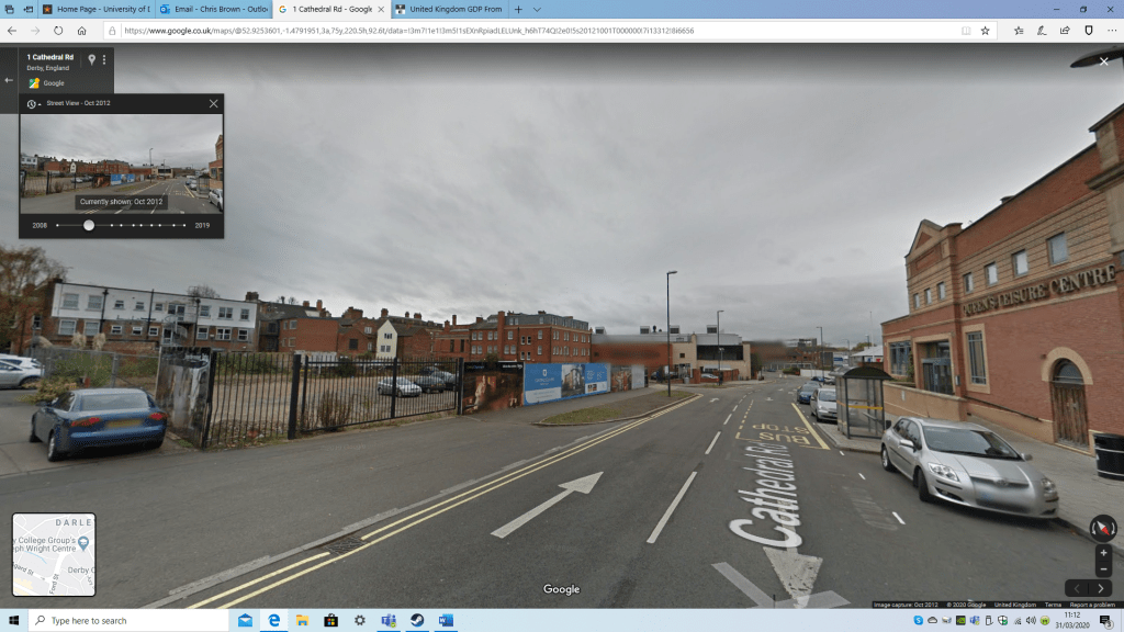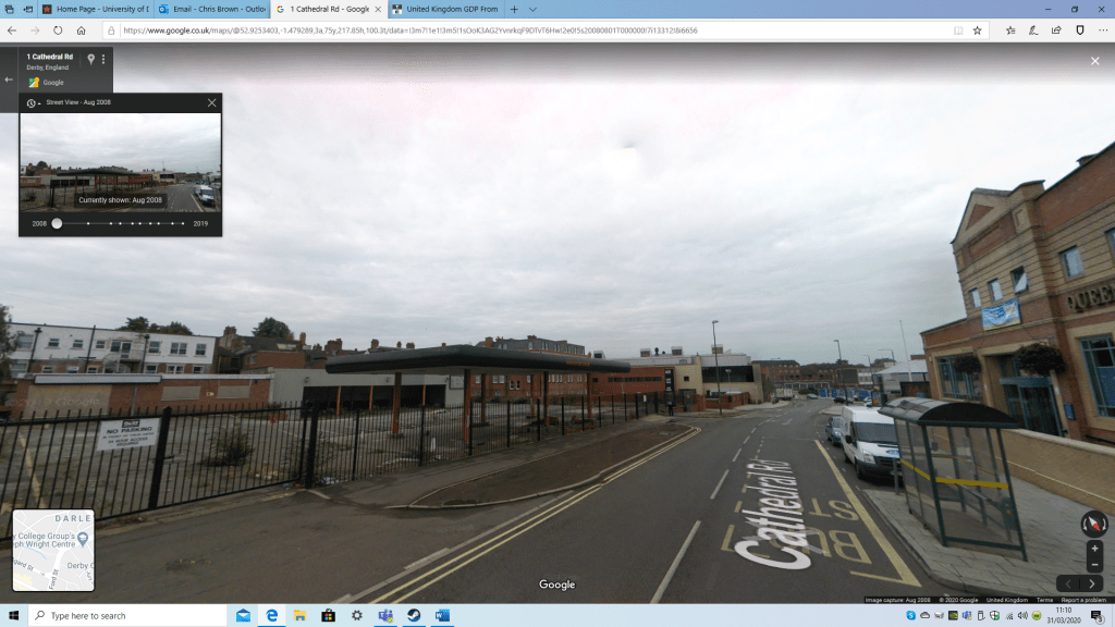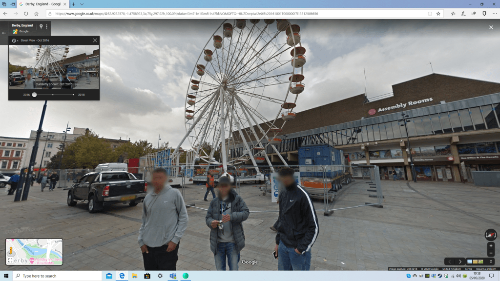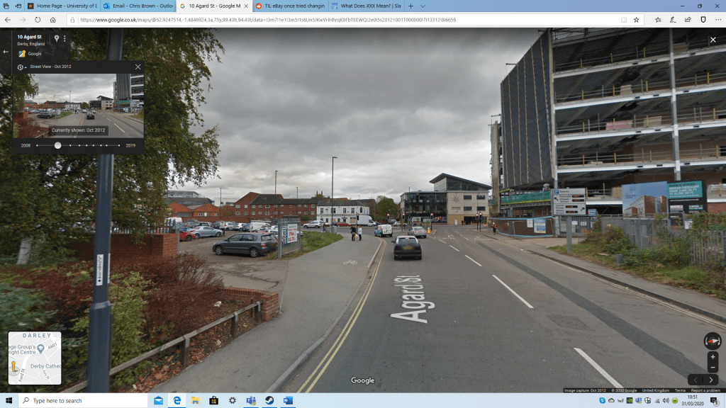 I Went on Google maps and went around several areas in Derby that were of personal interest and used the feature where in some areas of the world, you can change the year so you get a completely different perspective of the world. Because of the nature of my virtual walk, I looked through this from a visual perspective. Much of the Environments I explored has a great deal of familiarity since I visualised these spaces from my commutes from Joseph Wright Centre to Derby Bus Station and the other way around when I was in College. I picked Derby for my virtual walk because it is one of the places I am most familiar with despite my rural residence elsewhere.